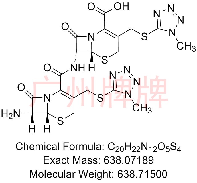 CAS No:N/A||Chemical Formula:C20H22N12O5S4||Molecular Weight:638.71500||Exact Mass:638.07189||(6R,7R)-7-((6R,7R)-7-amino-3-(((1-methyl-1H-tetrazol-5-yl)thio)met……