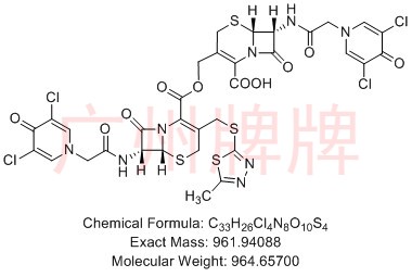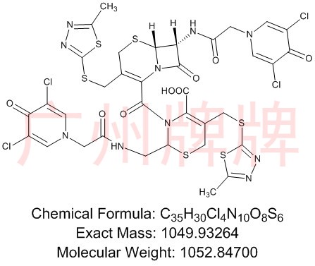 CAS No:N/A||Chemical Formula:C35H30Cl4N10O8S6||Molecular Weight:1052.84700||Exact Mass:1049.93264||3-((6R,7R)-7-(2-(3,5-dichloro-4-oxopyridin-1(4H)-yl)acetamido……