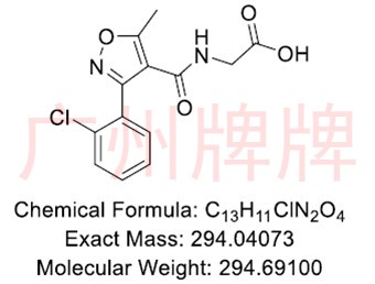 CAS No:1642559-64-5 ||Chemical Formula:C18H20ClN3O4S ||Molecular Weight:409.88500 ||Exact Mass:409.08630 ||(4S)-2-((3-(2-chlorophenyl)-5-methylisoxazole-4-carboxamido)methyl)-5,5-dimethylthiazolidine-4-carboxylic acid