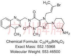 CAS No:1446263-39-3||Chemical Formula:C25H29BrN8O2||Molecular Weight:553.46500||Exact Mass:552.15968||(R,E)-8-(3-aminopiperidin-1-yl)-7-(3-bromobut-2-en-1-yl)-3……