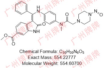 CAS NO:|Chemical Formula: C30H30N6O5|Molecular Weight: 554.60700|Exact Mass:554.22777|methyl (Z)-3-(((4-(N-methyl-2-(4-nitrosopiperazin-1-yl)acetamido)phenyl)am……