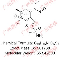 CAS NO:|Chemical Formula: C10H15N3O5S3|Molecular Weight: 353.42600|Exact Mass:353.01738|(4S,6S)-4-(ethyl(nitroso)amino)-6-methyl-5,6-dihydro-4H-thieno[2,3-b]thi……