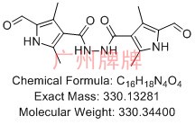 CAS No:N\A||Chemical Formula:C16H18N4O4||Molecular Weight:330.34400||Exact Mass:330.13281||5-formyl-N'-(5-formyl-2,4-dimethyl-1H-pyrrole-3-carbonyl)-2,4-dimethy……